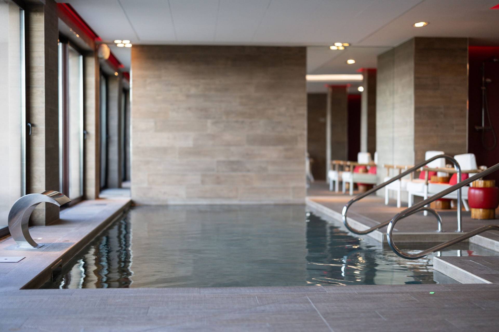 Un espace détente avec une piscine, un sauna, un hammam ainsi qu’un solarium avec vue sur les vignes.